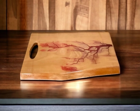 Wat deze plank extra bijzonder maakt, is de invulling met gekleurde epoxy. De epoxy wordt in de gravure gegoten en zorgvuldig uitgehard, waardoor een opvallend en levendig contrast ontstaat tussen het warme hout en de glanzende kleuren. Elke kleurcombinatie is uniek, waardoor geen enkele Branch tapasplank hetzelfde is. Zo heb je altijd een exclusief stuk in handen, dat niet alleen functioneel is maar ook als gespreksonderwerp tijdens diners of borrelmomenten fungeert.
