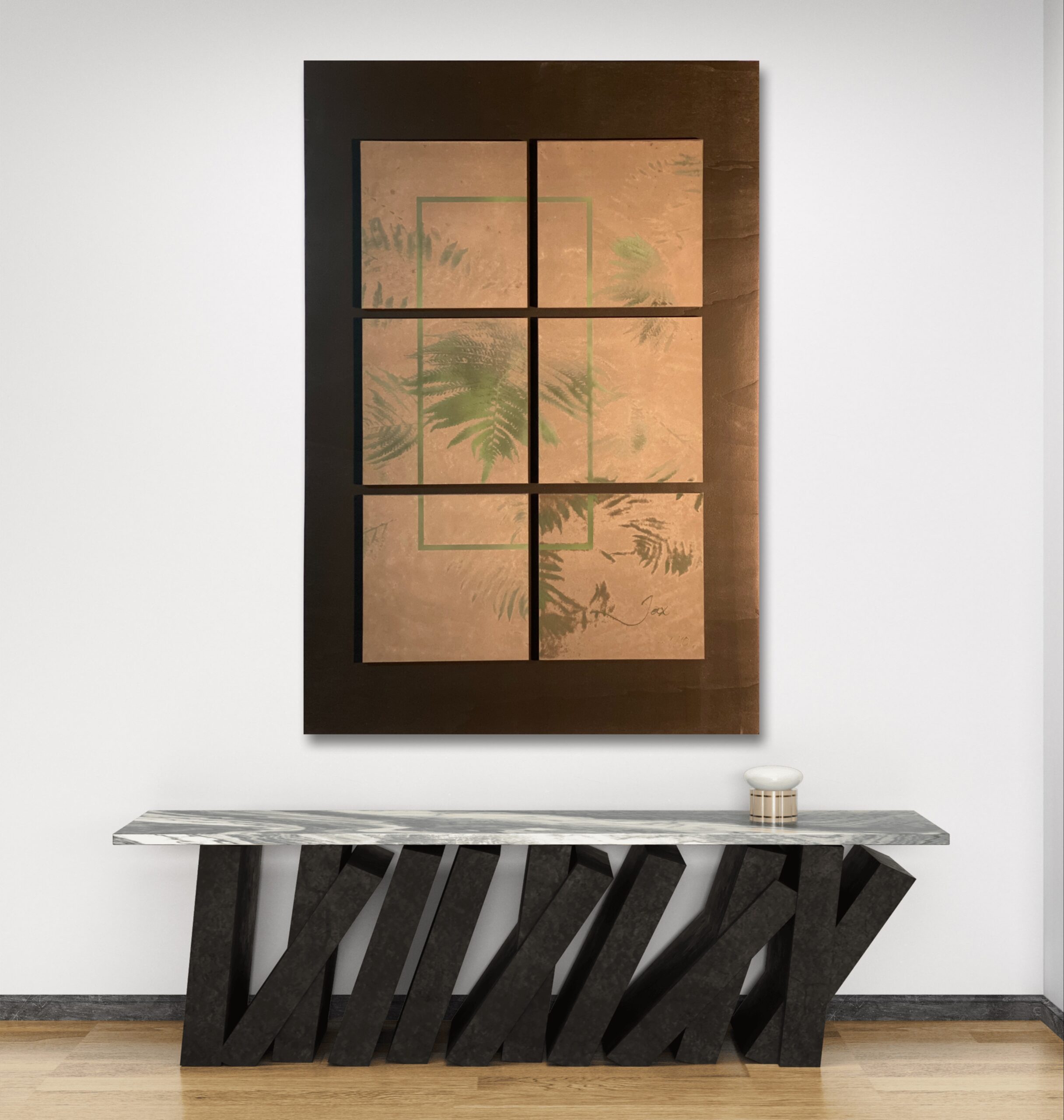 Ontdek “Leaves”, een uniek schilderij en kunstobject van de Belgische kunstenaar Jax. Als nummer 1 in een gelimiteerde reeks van 10 unieke werken, combineert dit exclusieve kunstwerk natuurlijke groentinten en abstracte varenpatronen. Gesigneerd en voorzien van een certificaat van authenticiteit. Perfect als luxueuze wallart of kunstvoorwerp dat elegantie toevoegt aan elke ruimte.