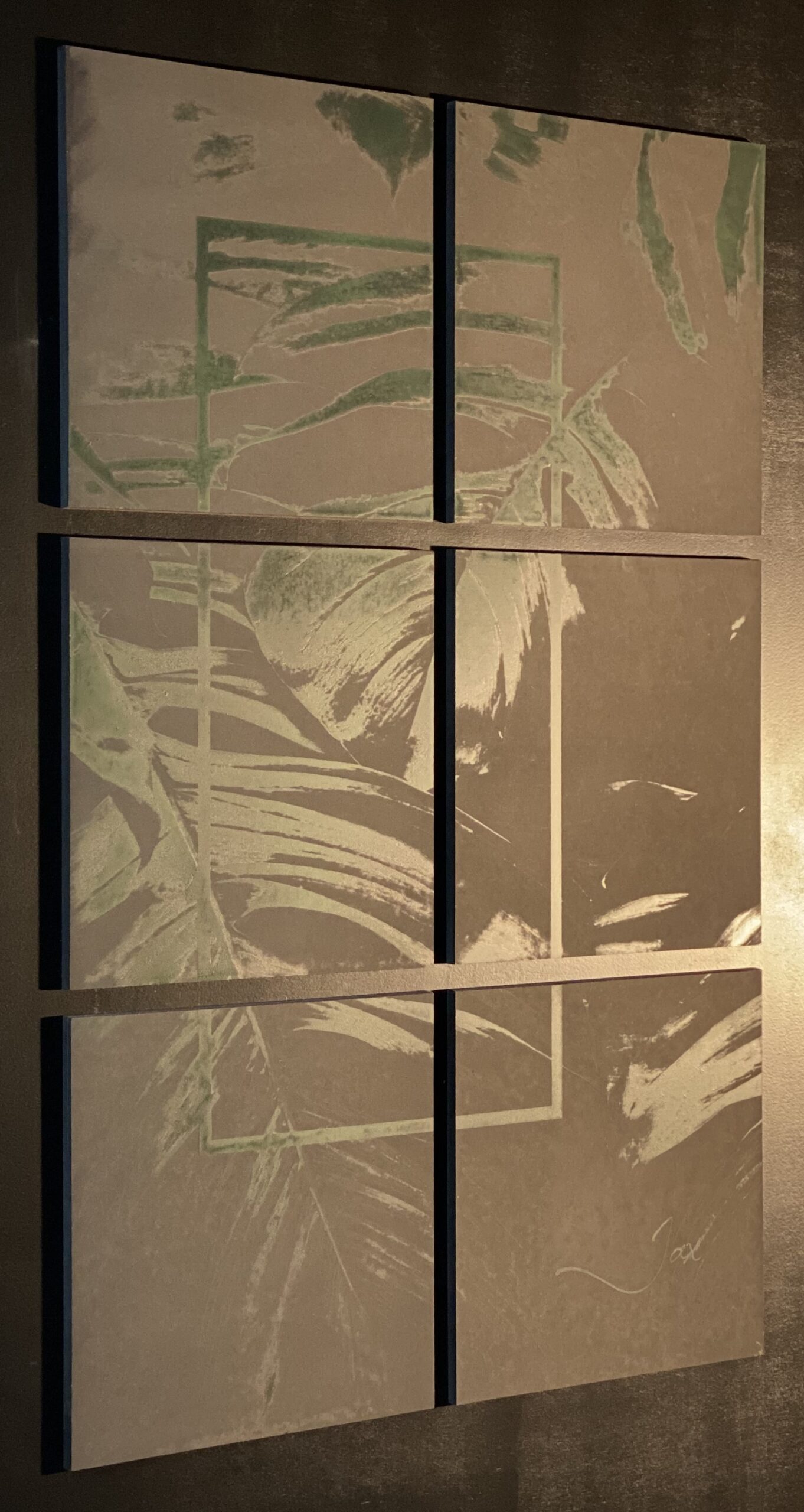 Laat je inspireren door “Leaves 2”, een adembenemend kunstwerk van de Belgische kunstenaar Jax dat de tropische charme van Monstera-bladeren vangt in een abstracte en verfijnde compositie.