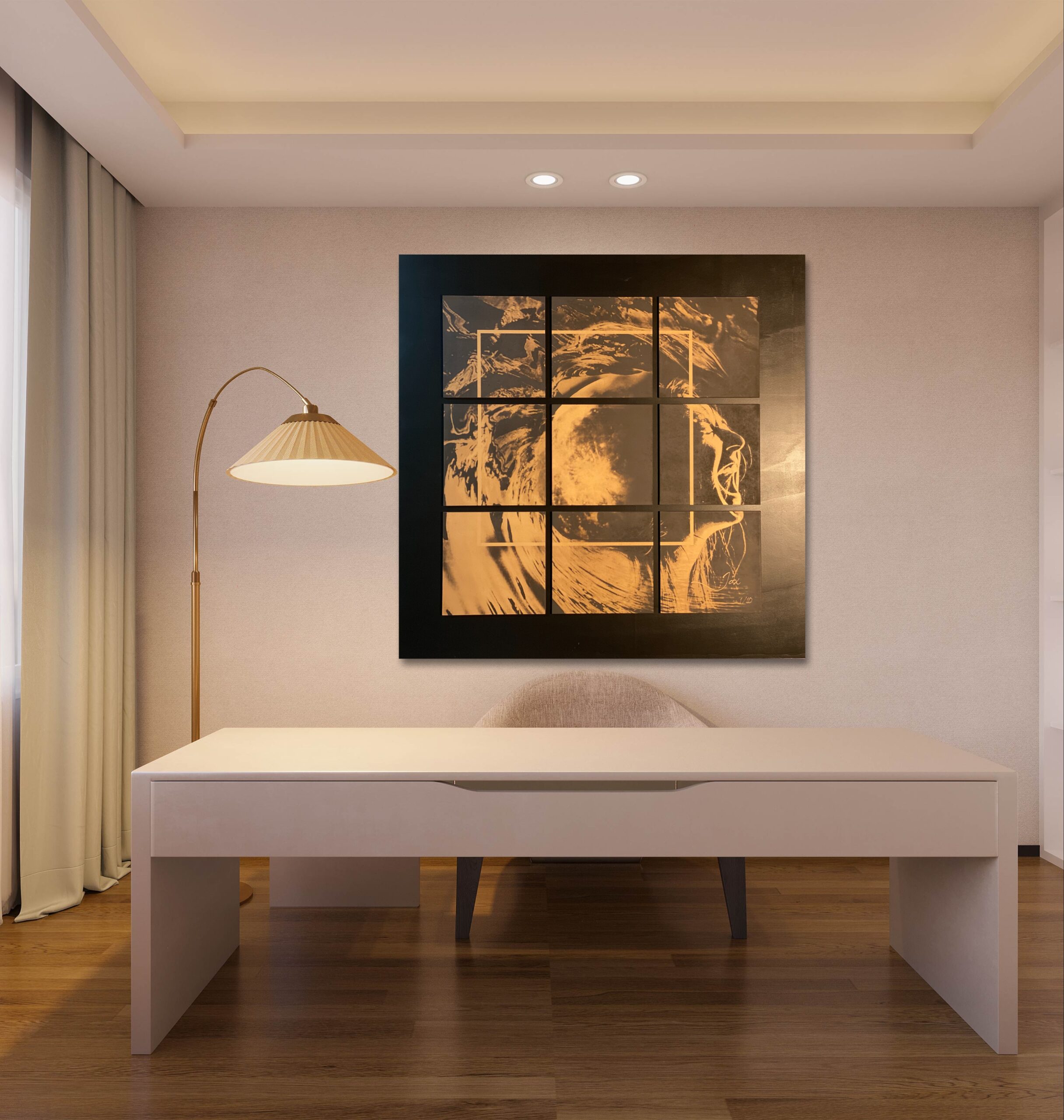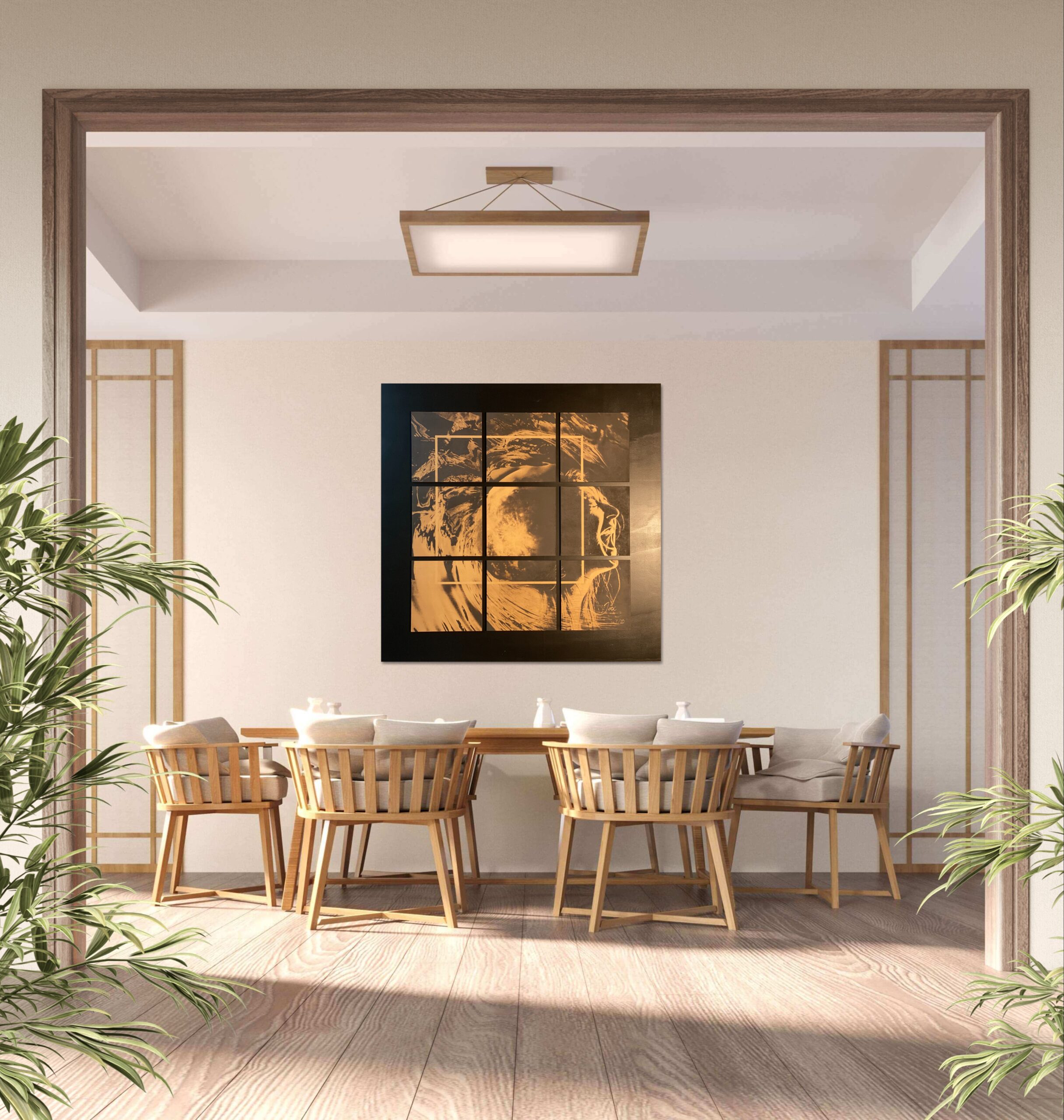 Het gebruik van hoogwaardige materialen zoals koperkleurige MDF en multiplex benadrukt de luxueuze uitstraling van dit kunstobject. De matte vernislaag voegt een verfijnde afwerking toe, terwijl het ophangsysteem het eenvoudig maakt om dit kunstwerk als wallart in jouw interieur te integreren.