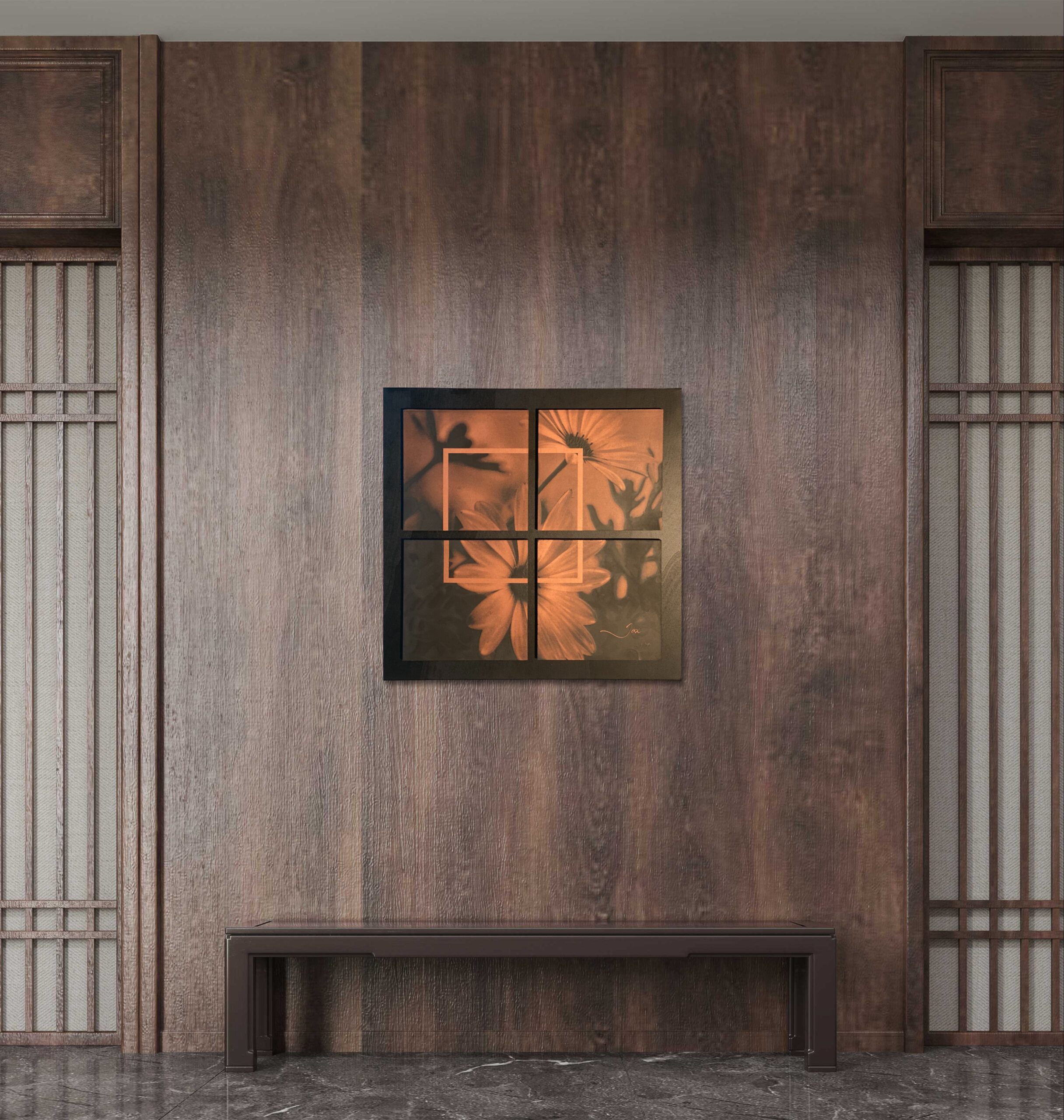 “Daisies” is zorgvuldig vervaardigd met behulp van lasergravure op koperkleurige zwarte MDF-plaatjes van 250 x 250 x 10 mm. Deze plaatjes zijn afgewerkt met een matte vernis voor een subtiele, elegante glans en verlijmd op een tableau van zwart gelakte multiplex van 600 x 600 x 55 mm. Het kunstwerk wordt geleverd met een handig ophangsysteem, zodat je direct kunt genieten van deze prachtige toevoeging aan jouw interieur.