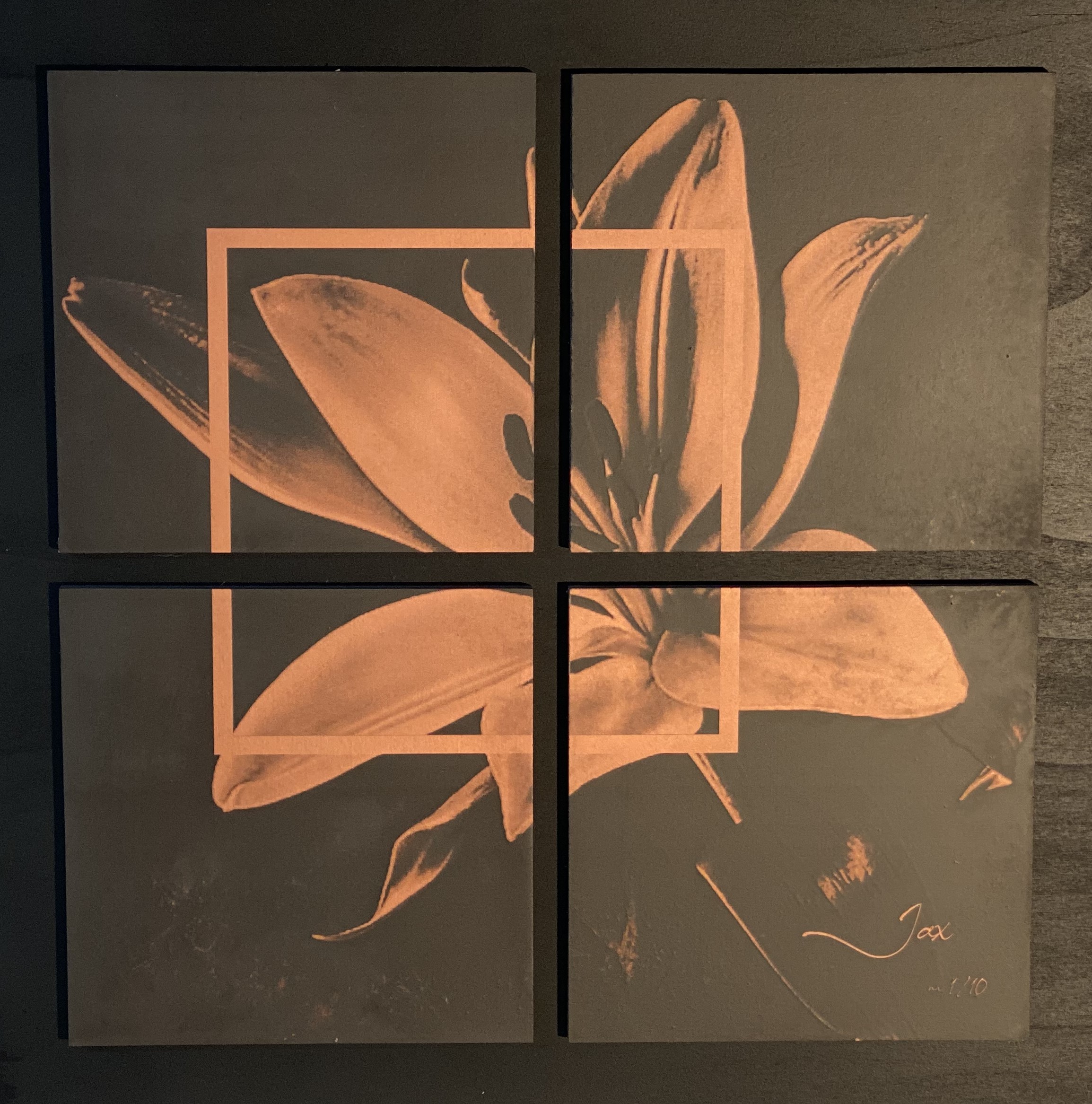 Het maakproces van “Lilly” weerspiegelt de toewijding van kunstenaar Jax aan precisie en esthetiek. De lasergravure-techniek zorgt voor scherpe, gedetailleerde lijnen, terwijl de matte vernis een subtiele glans toevoegt die het geheel naar een hoger niveau tilt. Elk kunstwerk wordt zorgvuldig samengesteld en met de hand afgewerkt, waardoor het een uniek karakter krijgt.