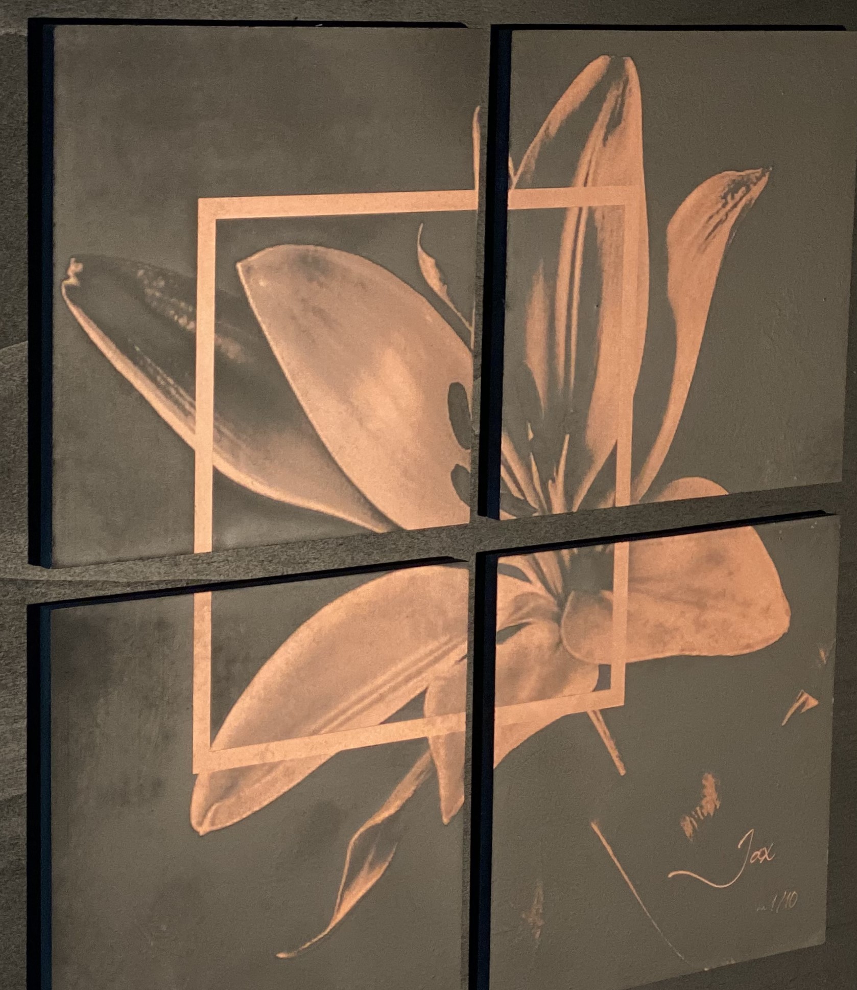 Elk exemplaar van “Lilly” is met de hand vervaardigd, waarbij moderne technieken zoals lasergravure worden gecombineerd met traditionele artistieke vaardigheden. Het kunstwerk bestaat uit koperkleurige zwarte MDF-plaatjes van 250 x 250 x 10 mm, die zorgvuldig zijn afgewerkt met een matte vernis. De plaatjes zijn op een tableau van zwart gelakte multiplex van 600 x 600 x 55 mm bevestigd, wat het kunstwerk een moderne en luxueuze uitstraling geeft.