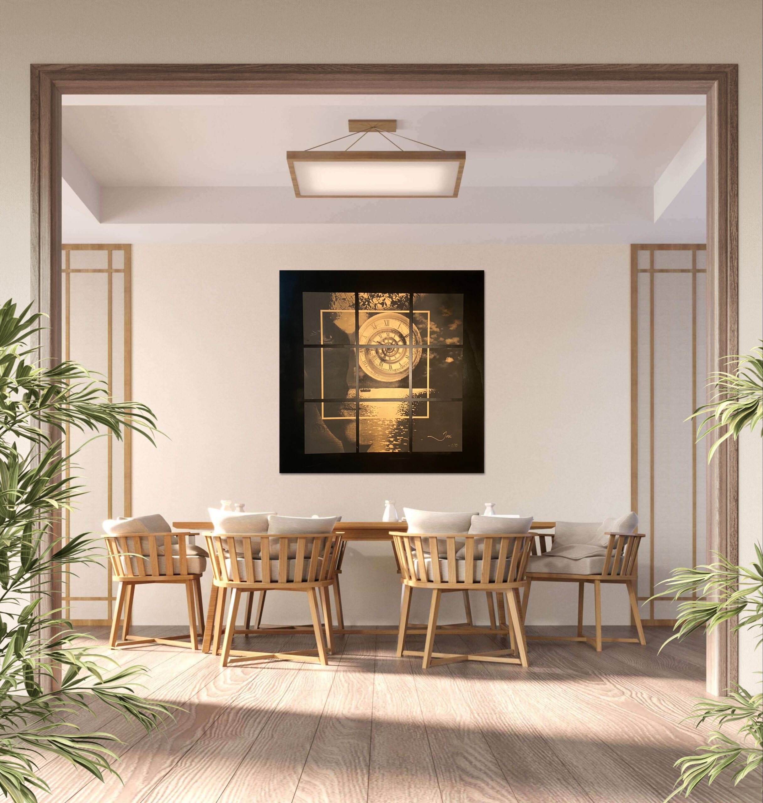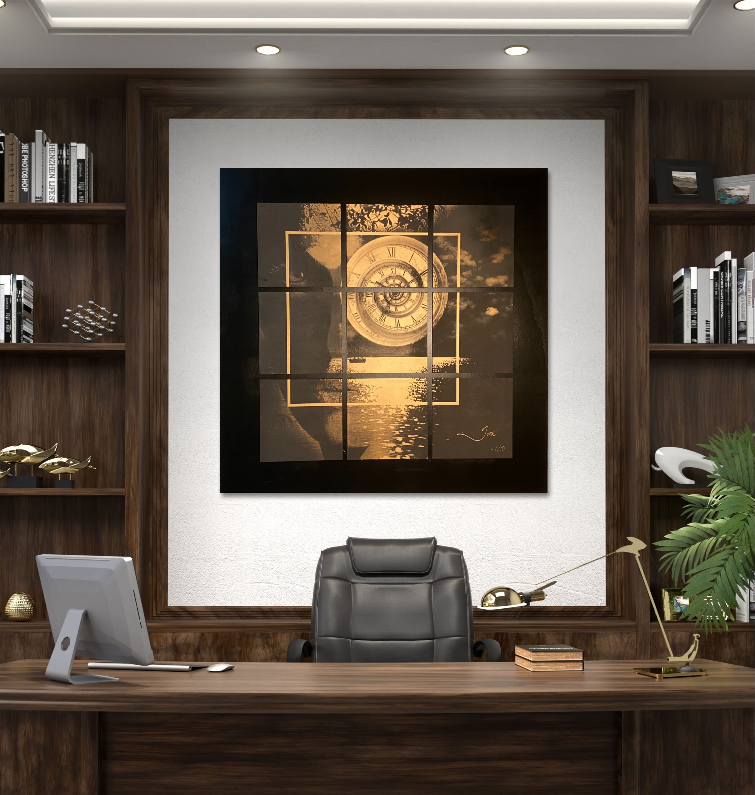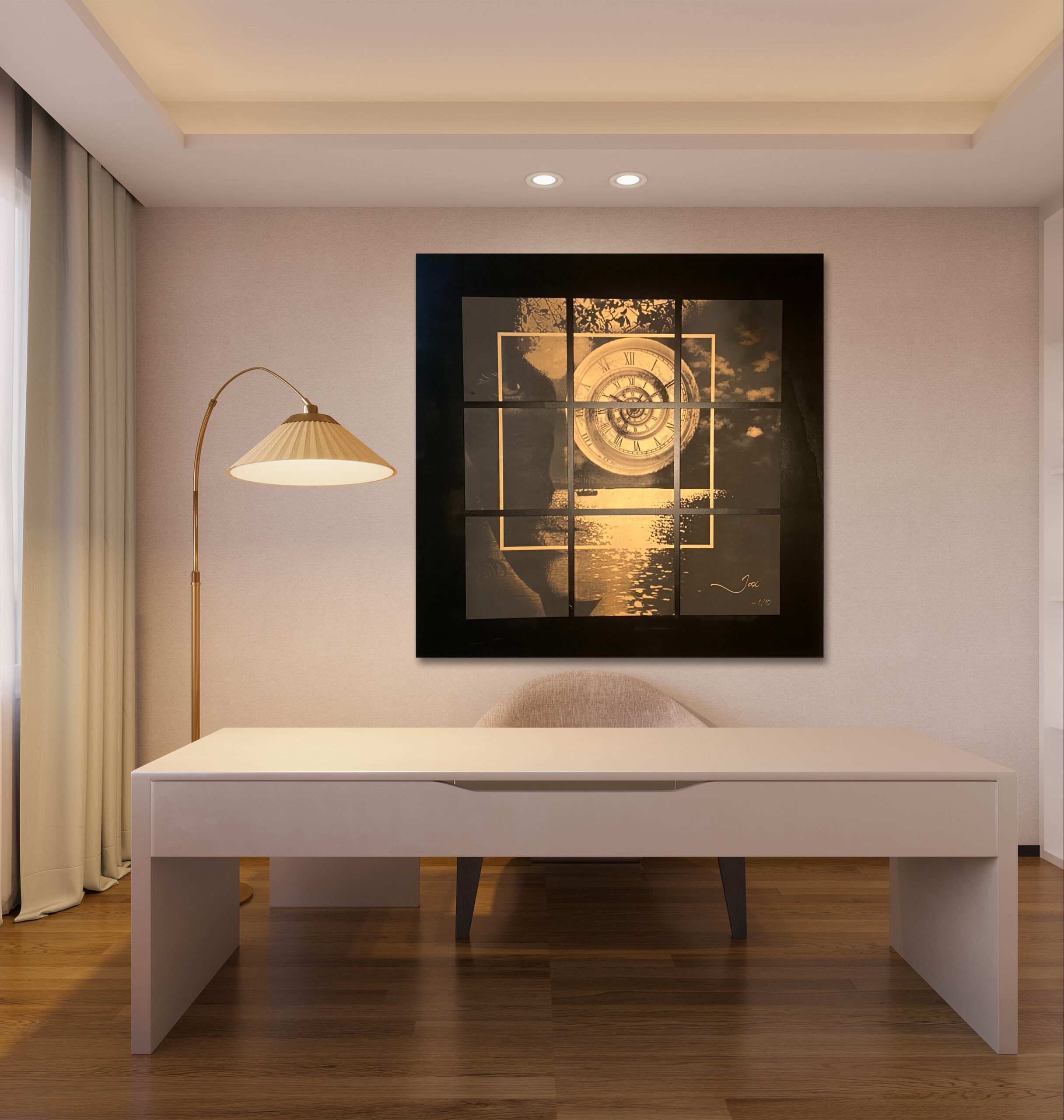 Ervaar de meeslepende kracht van “Sign of Times”, een exclusief kunstwerk van de Belgische kunstenaar Jax, dat de complexe relatie tussen tijd en toekomst visualiseert. Dit luxueuze schilderij, het eerste in een gelimiteerde reeks van 10 unieke werken, is een prachtige lasergravure op koperkleurig gelakte zwarte MDF, verlijmd op een tableau van zwart gelakte multiplex. Met indrukwekkende afmetingen van 120 bij 120 cm, is dit kunstobject gesigneerd en wordt het geleverd met een certificaat van authenticiteit. Dit unieke kunstvoorwerp is een ware blikvanger voor liefhebbers van hoogwaardige wallart en luxueuze kunstwerken.