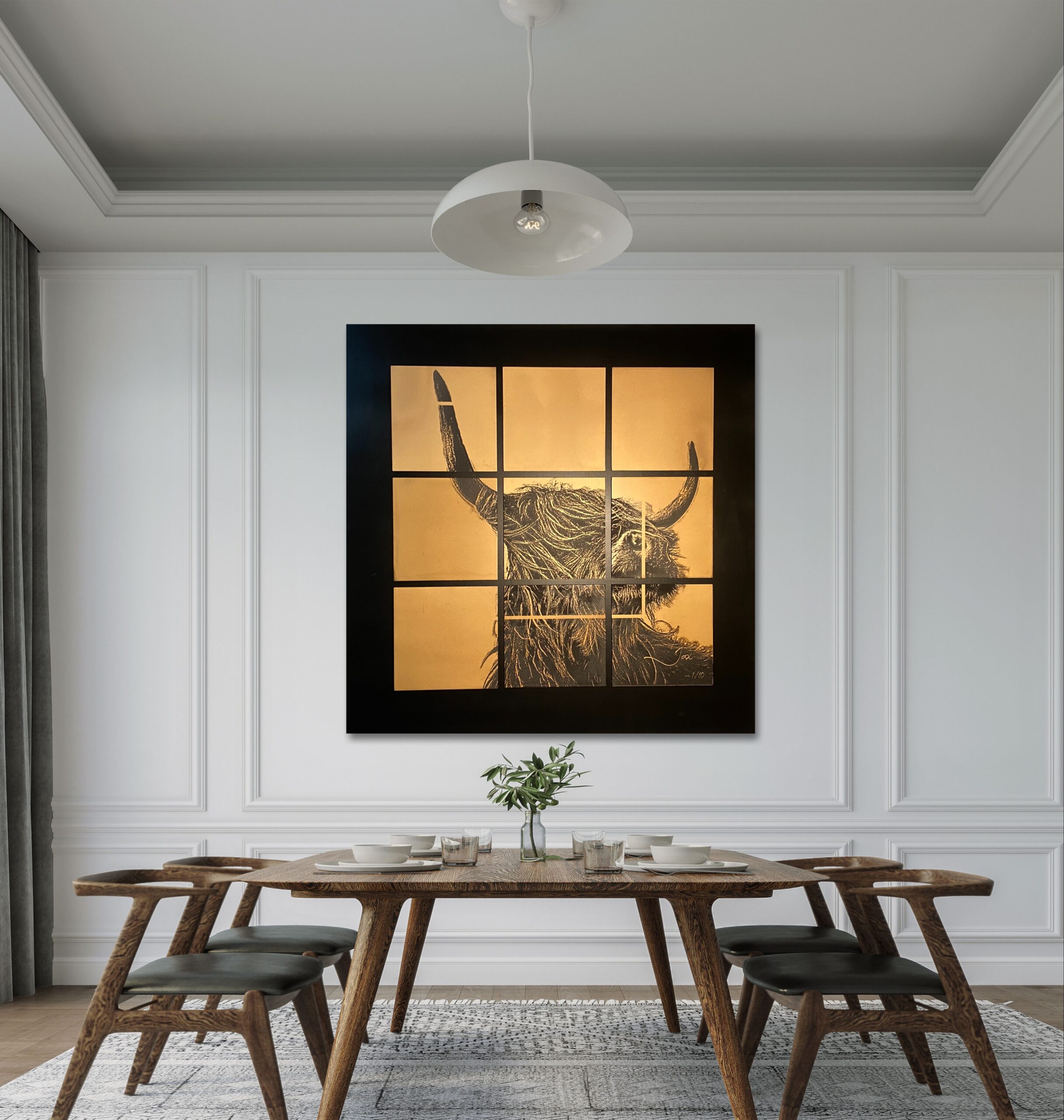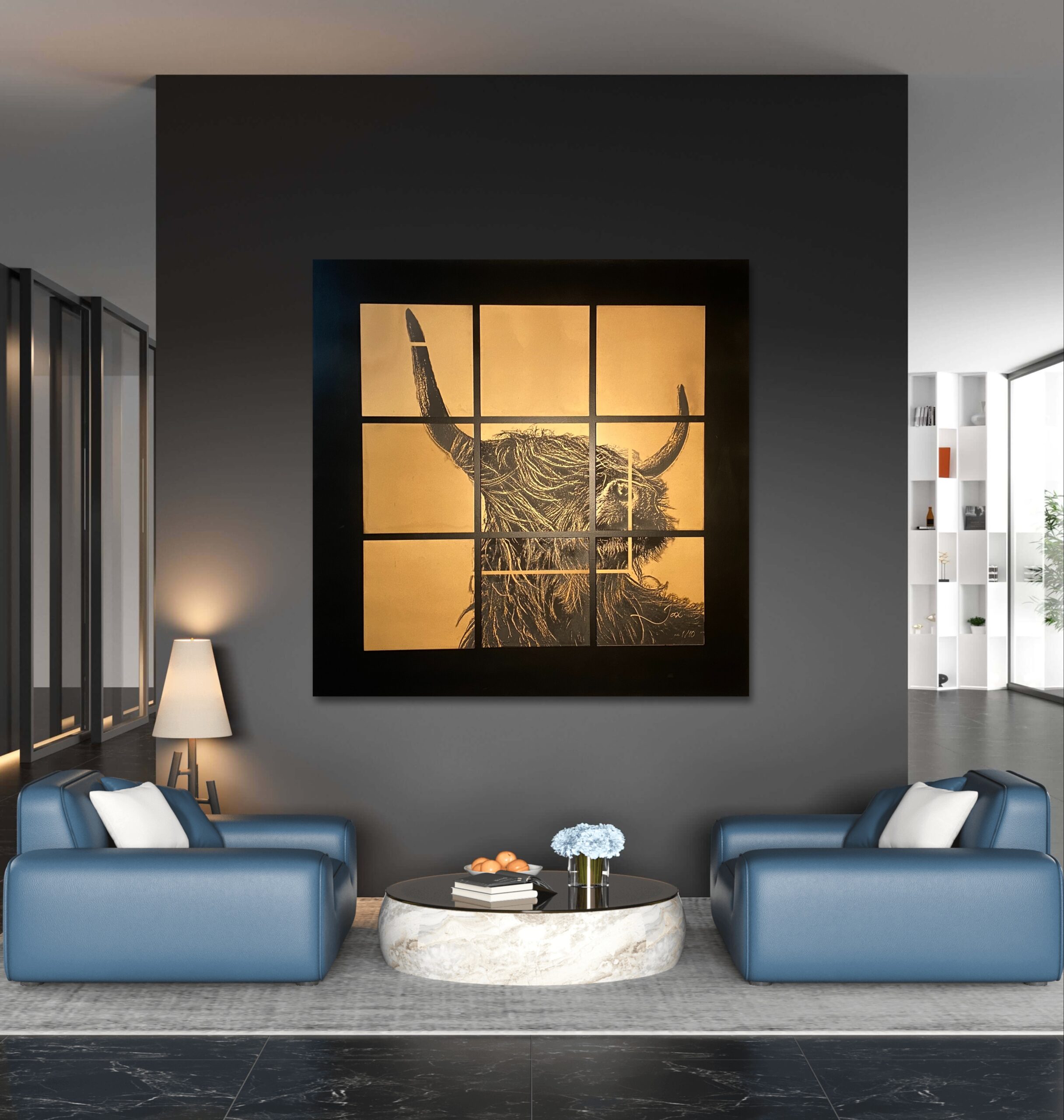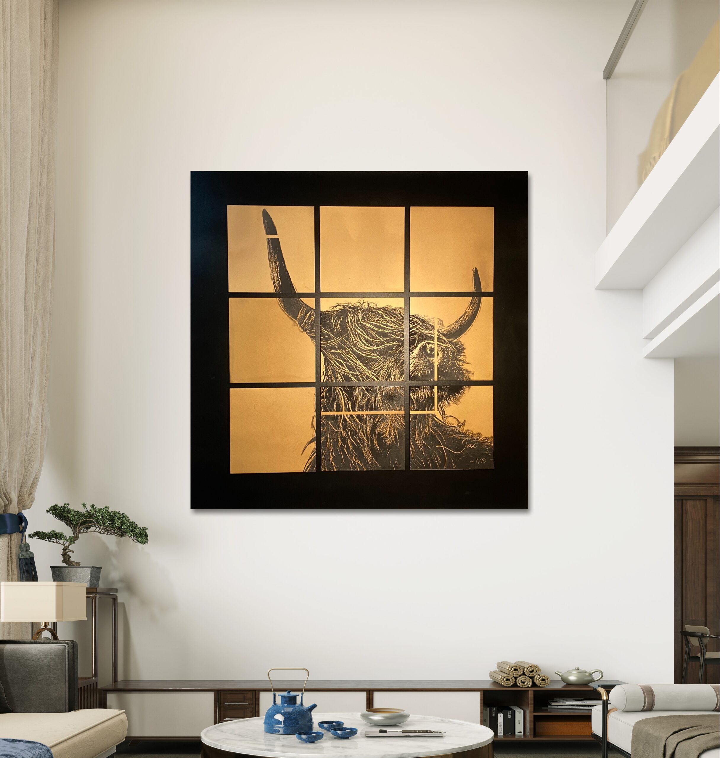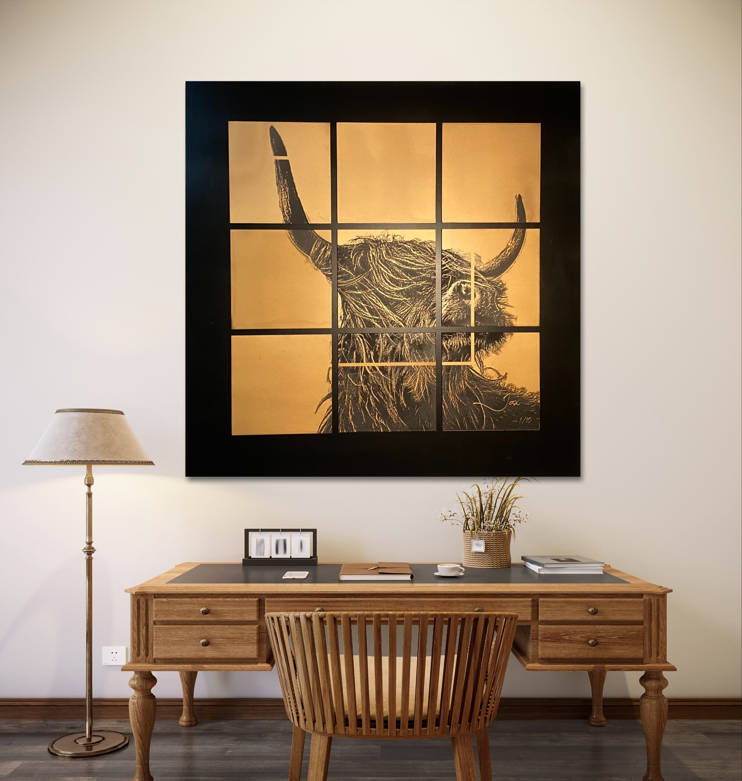 “Spirit of the Highlander” is vervaardigd uit hoogwaardige materialen zoals medium multiplex en zwarte MDF, waarbij een lasergravure op koperkleurig gelakte MDF plaatjes is toegepast. Deze plaatjes, met afmetingen van ongeveer 30 x 30 cm, zijn zorgvuldig afgewerkt met een matte vernis en verlijmd op een tableau van zwart gelakte multiplex. Dit resulteert in een robuust en luxueus kunstobject dat de rauwe kracht en natuurlijke schoonheid van de Schotse hooglander perfect weergeeft.