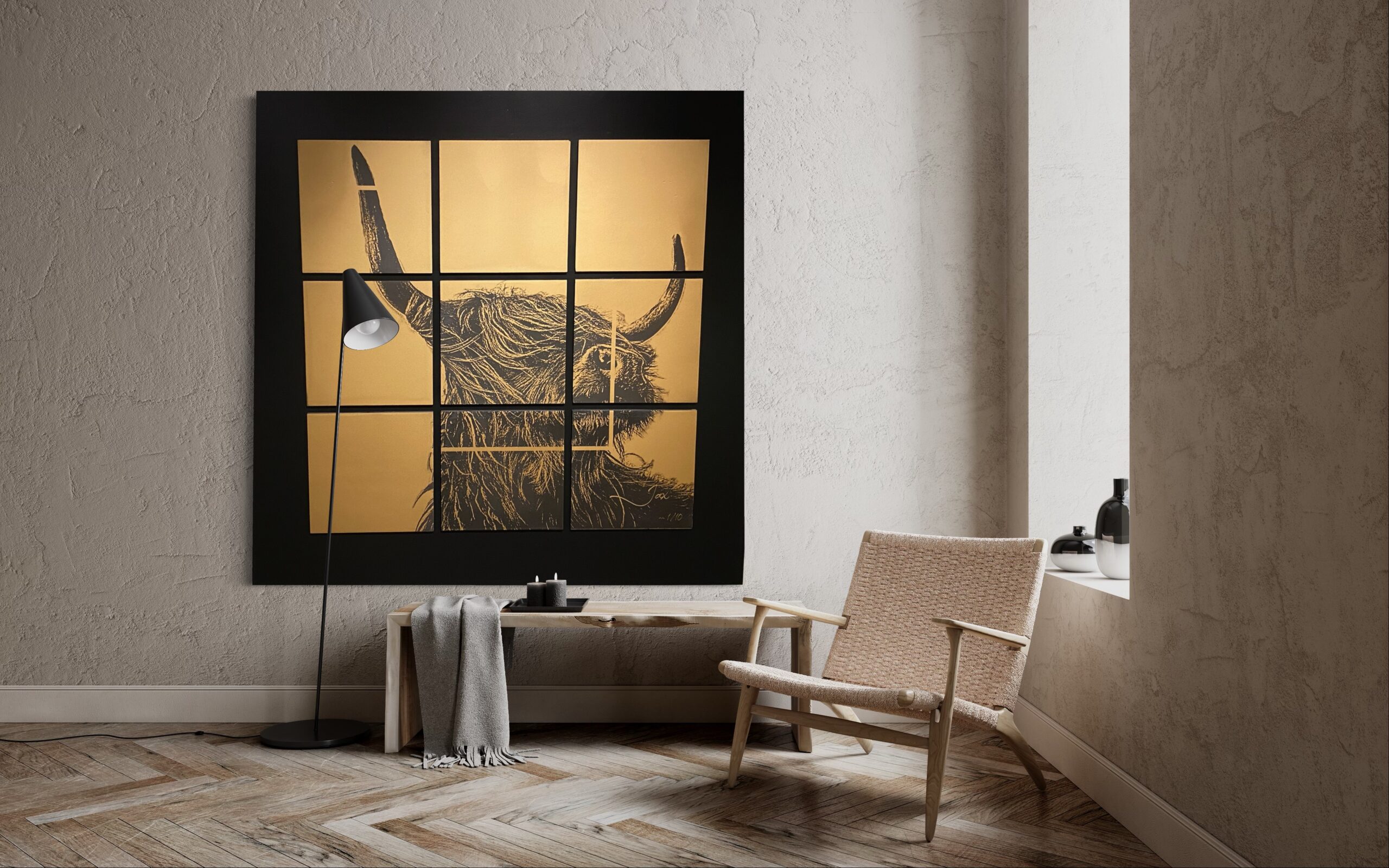 Ontdek de betovering van de Schotse Hooglanden met “Spirit of the Highlander”, een exclusief kunstwerk gemaakt door de Belgische kunstenaar Jax. Dit unieke schilderij, het eerste in een beperkte reeks van 10, vangt de kracht en sereniteit van de Schotse hooglander in een meesterlijke lasergravure op koperkleurig gelakte zwarte MDF. Met afmetingen van 120 bij 120 cm, straalt dit luxueuze kunstobject zowel kracht als elegantie uit. Gesigneerd door de kunstenaar en geleverd met een certificaat van authenticiteit, biedt dit kunstvoorwerp een prachtige combinatie van kunst en natuur. Voeg een stukje Schotse majestueusheid toe aan jouw interieur met dit bijzondere kunstwerk.