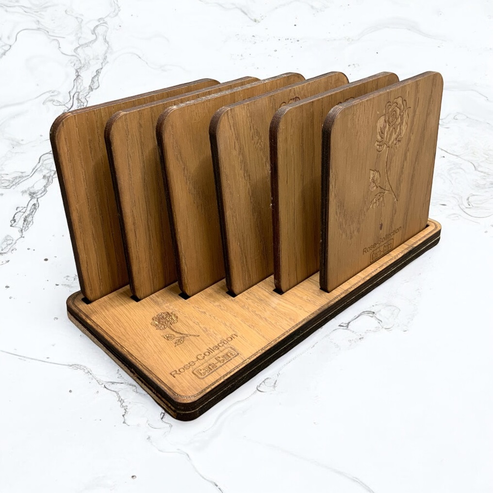 De elegantie en functionaliteit van deze onderzetterset maken het een must-have voor elk huishouden dat waarde hecht aan kwaliteit en stijl. Het eiken triplex zorgt voor een natuurlijke, warme uitstraling, terwijl de lasergravures een vleugje kunstzinnigheid toevoegen. De combinatie van duurzaamheid, esthetiek en exclusiviteit maakt deze set tot een waardevolle aanwinst voor je huis.