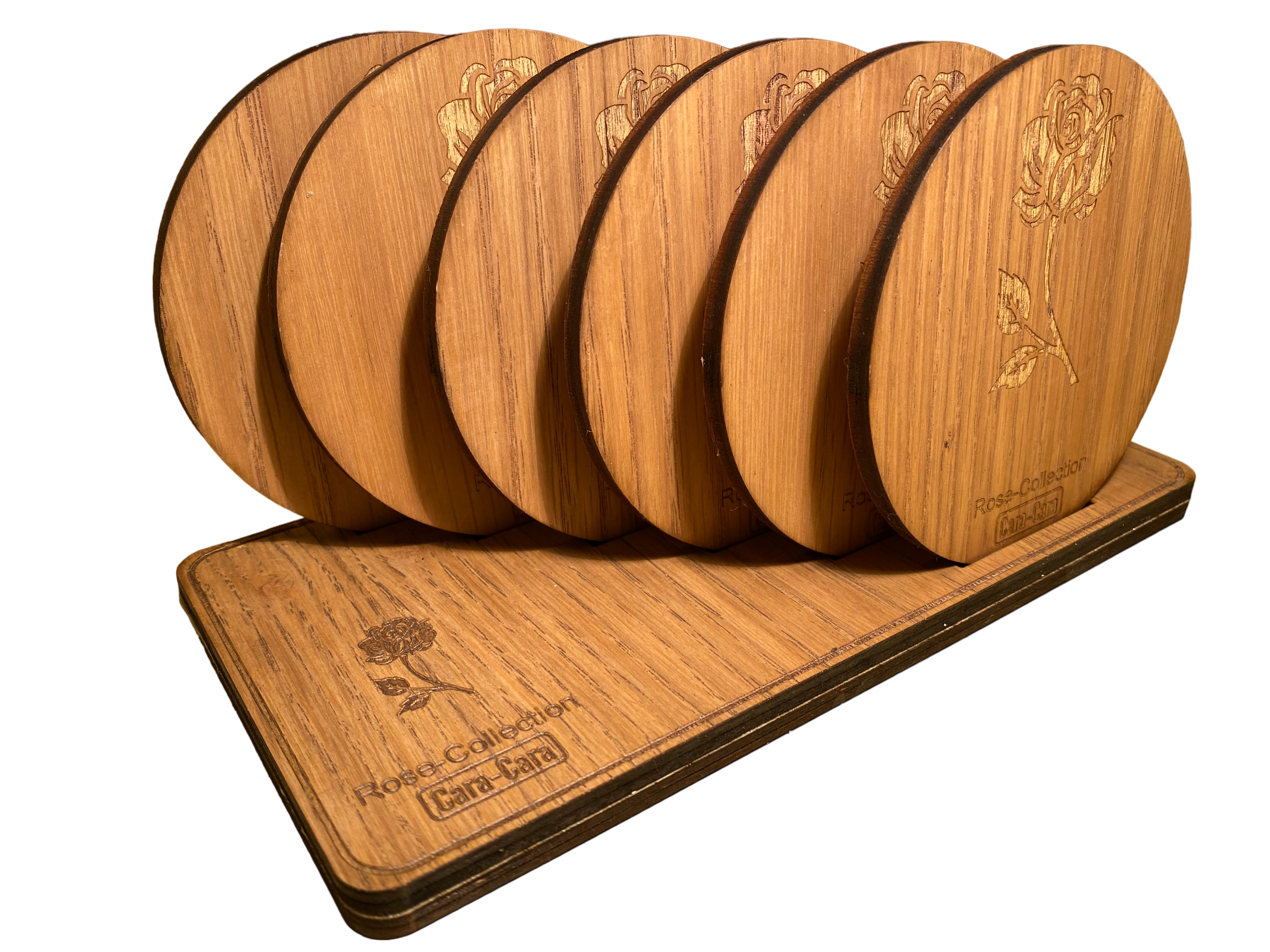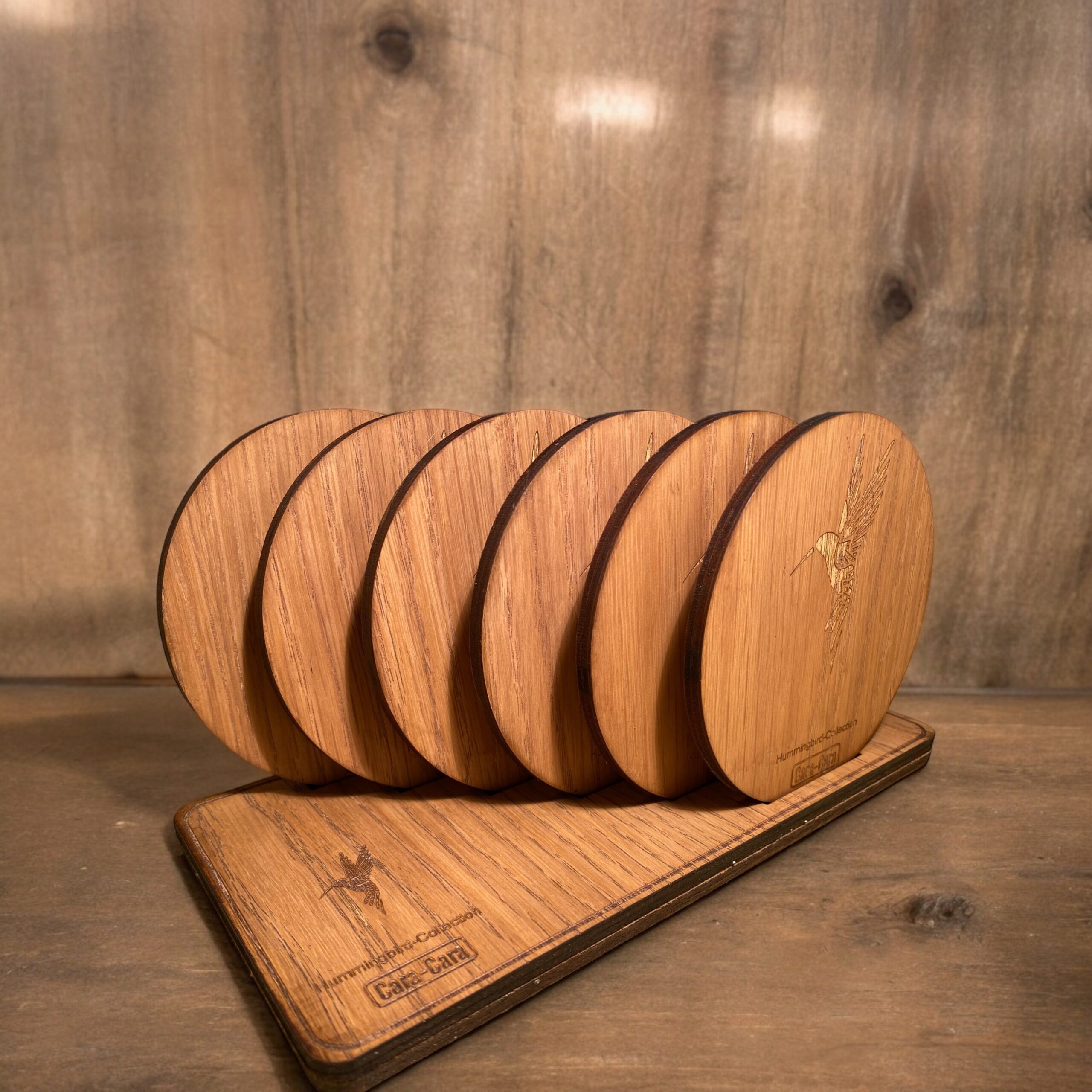De set van 6 onderzetters wordt geleverd met een bijpassende houder, wat zorgt voor een nette en georganiseerde presentatie wanneer de onderzetters niet in gebruik zijn. De houder is eveneens vervaardigd uit eiken triplex en voorzien van dezelfde hoogwaardige afwerking en lasergravures, waardoor hij perfect aansluit bij de onderzetters. Dit maakt de set niet alleen praktisch, maar ook een stijlvolle toevoeging aan je keuken of eetkamer.